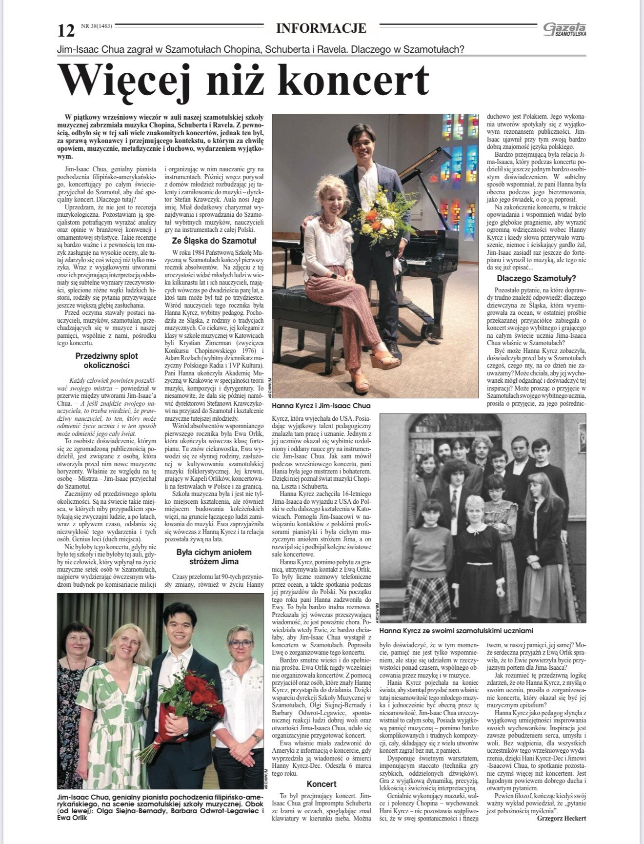 “Many excellent concerts have taken place in this hall, yet this one was an extraordinary event musically, metaphysically, and spiritually . . . His performances of Chopin’s mazurkas, waltzes, and polonaises leave no doubt that spiritually, in his spontaneity and refinement, he is Polish. His interpretations resonated deeply.”